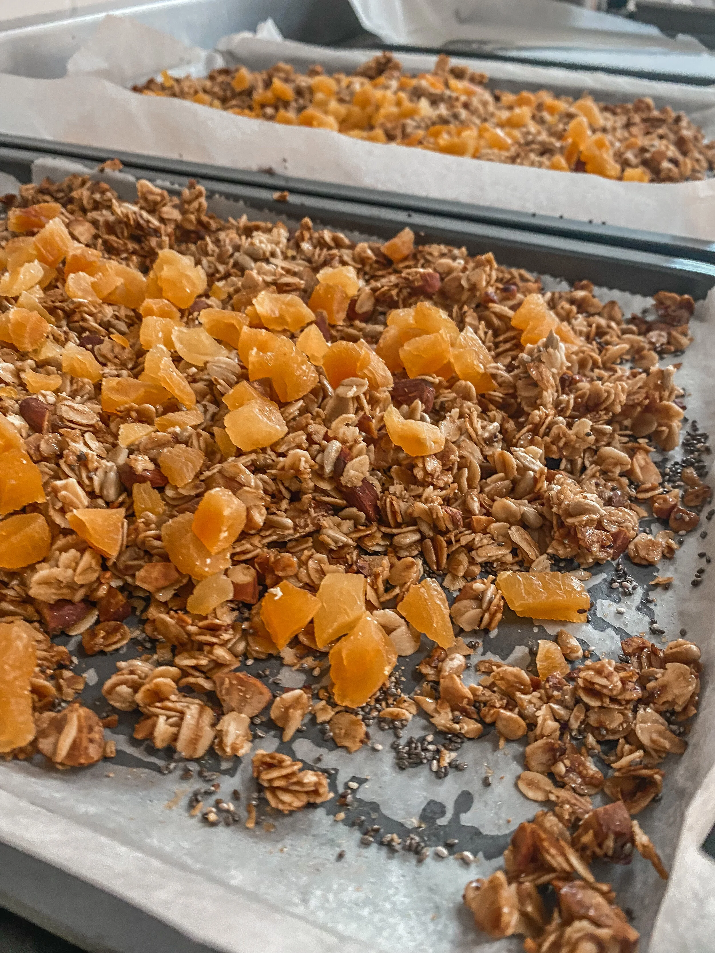 4. Take from the oven and set aside in the baking dish to cool. Once cooled add the diced apricots, sprinkle with chia seeds and mix.